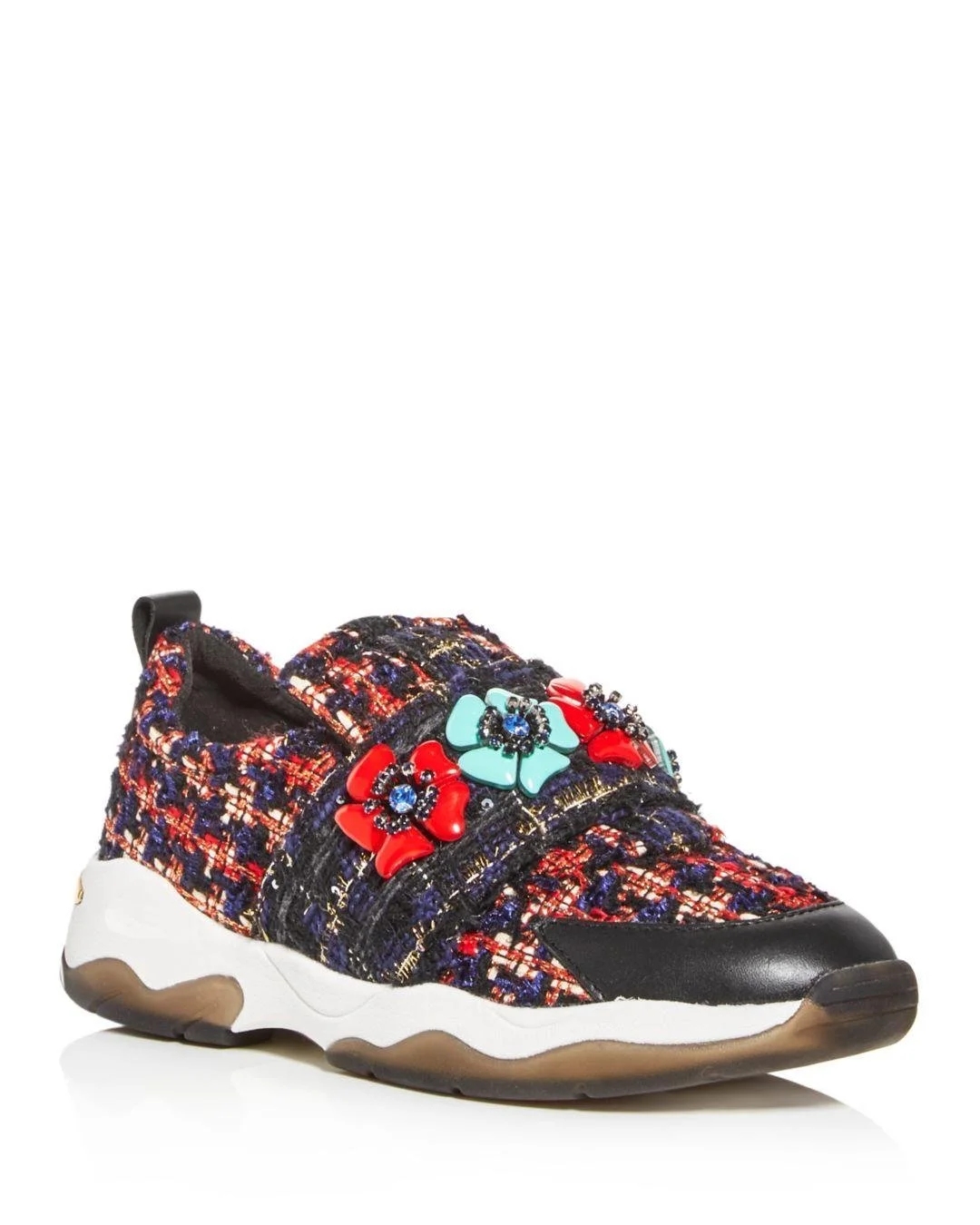 Elastic goring under tongue for a flexible fit. Mixed tweed upper. Instep strap with floral details with rhinestone embellishment. Leather detail at toe. Leather pull tab at heel. Logo hardware detail at heel.
