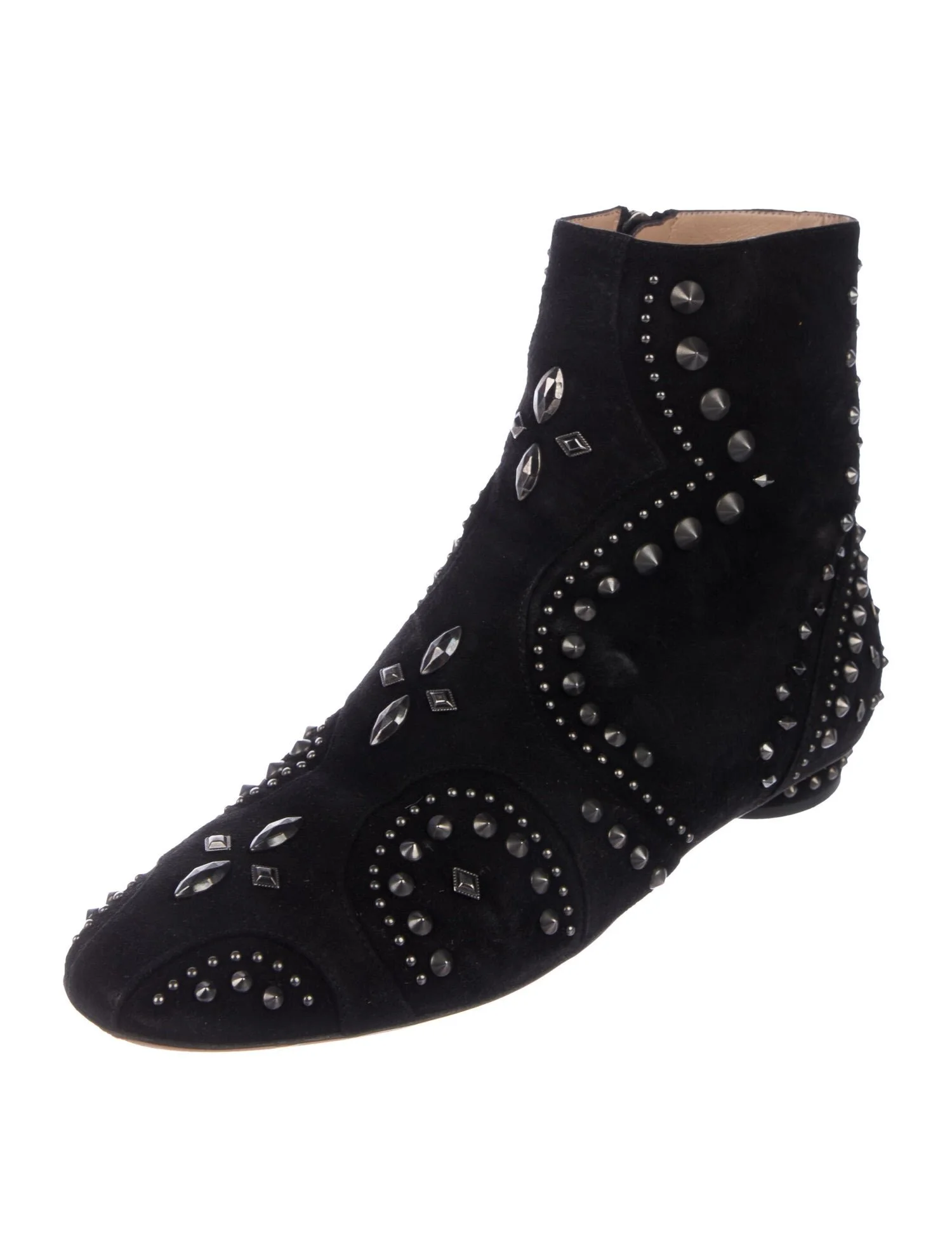 Black suede Valentino round toes ankle boots with gunmetal-tone stud embellishments throughout, covered heels and zip closures at insteps