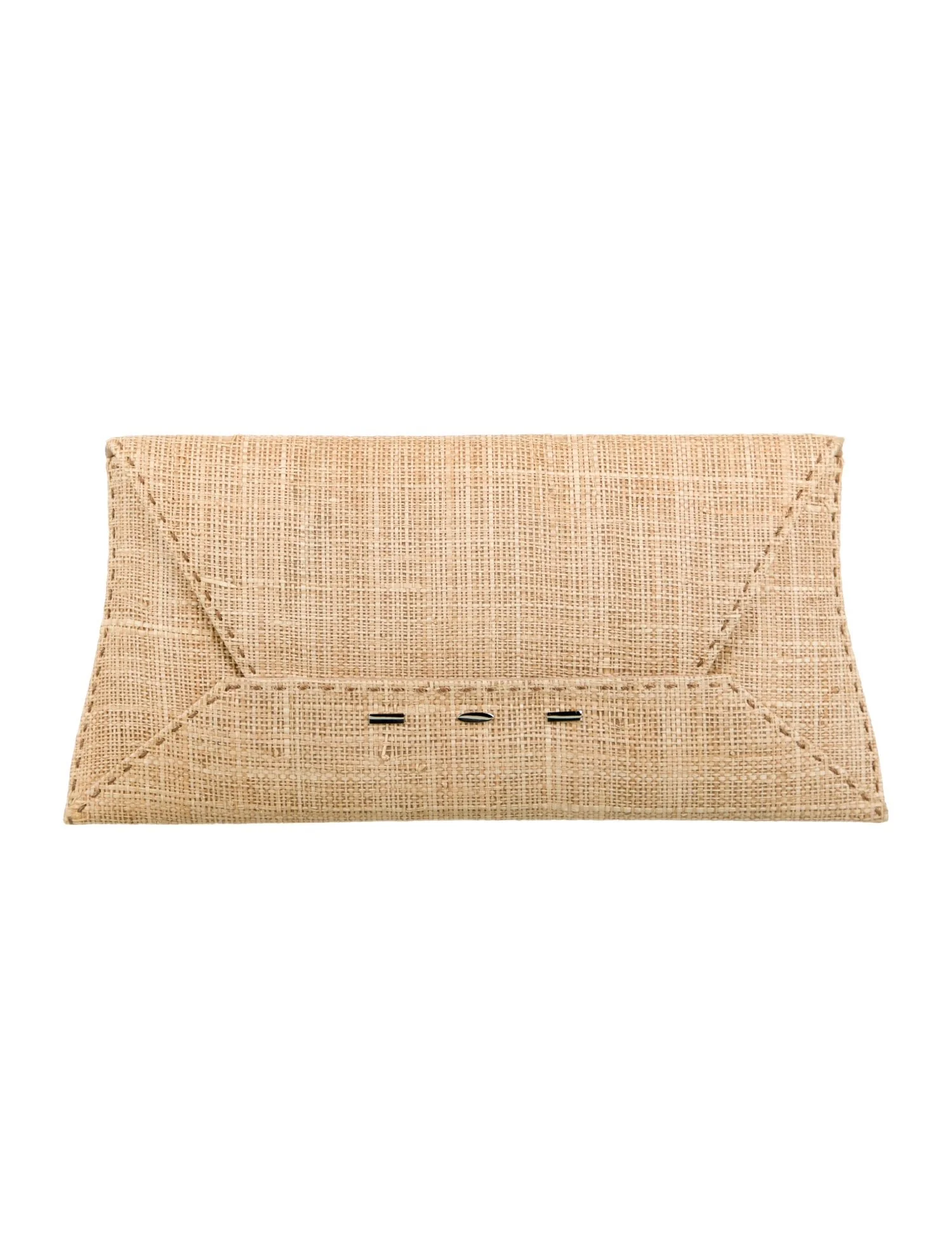 Natural woven straw VBH Manila clutch with silver-tone hardware, tonal suede lining, single card slot at interior wall and fold-in flap closure.
